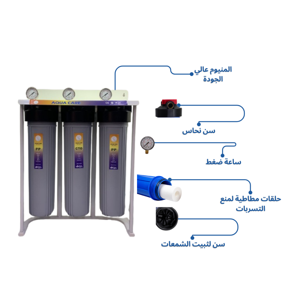 يضمن فلتر تنقية الجامبو ثلاثي المراحل حماية مثالية للأجهزة الكهربائية مثل غسالات الملابس، غسالات الصحون، والسخانات من الشوائب الصلبة مثل الأتربة، الطحالب، والصدأ، كما يعمل على تحسين جودة المياه عبر إزالة الروائح غير المرغوبة، مما يجعل استخدام المياه أكثر نقاءً وصحةً.